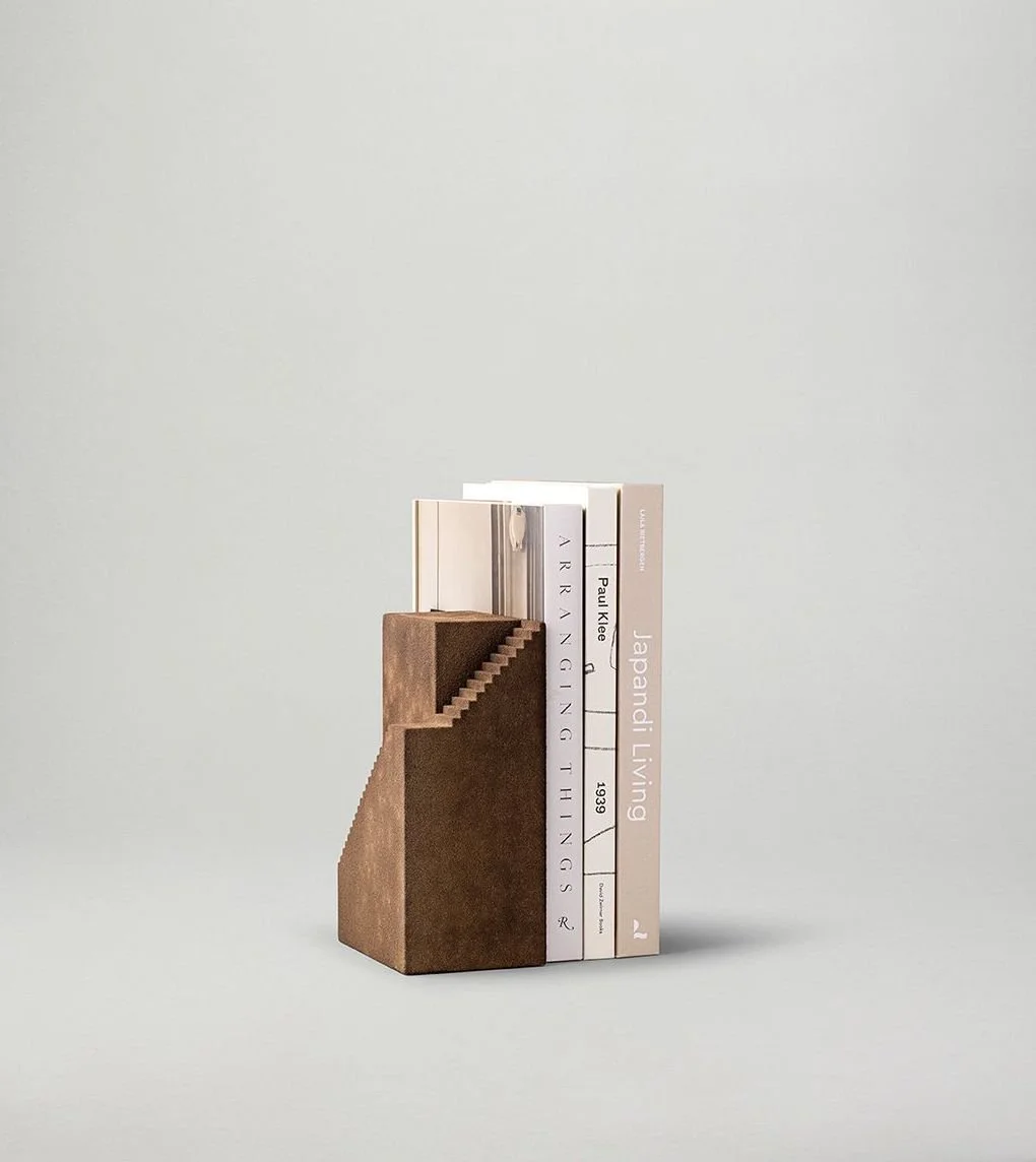 The Norm l bookend sculpture by Norm Architects, a beautiful standalone piece designed to elegantly support your displayed line of books. Crafted from synthetic sand, its architectural forms offer both delicate texture and robust strength, ensuring your books remain neatly in place